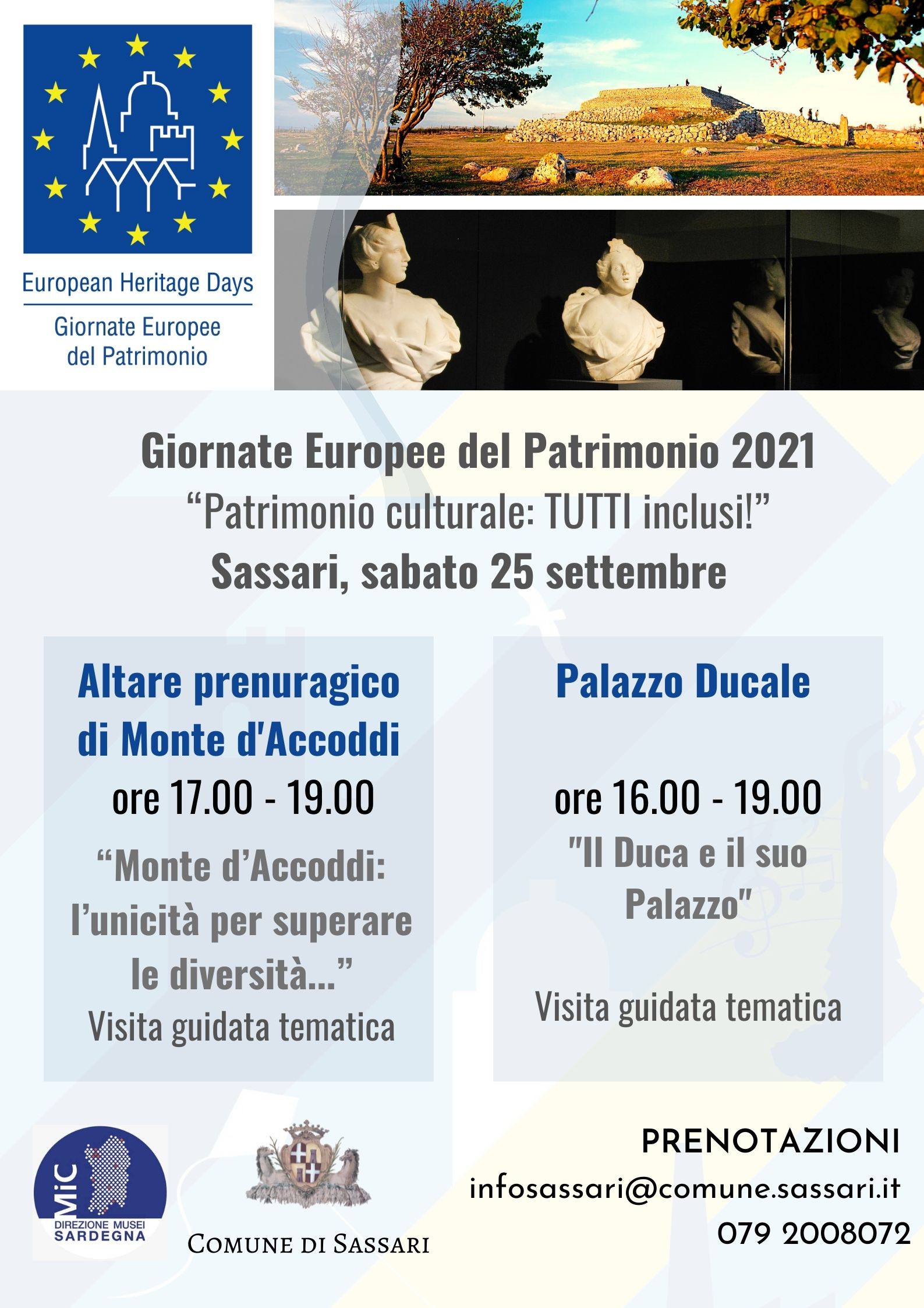 Anche quest’anno si celebrano in Italia le GEP – Giornate Europee del Patrimonio (European Heritage Days), la più estesa e partecipata manifestazione culturale d’Europa. Visite guidate, aperture straordinarie, iniziative digitali saranno organizzate nei musei e nei luoghi della cultura. Il Comune di Sassari, in collaborazione con la Direzione regionale Musei della Sardegna, aderisce all’iniziativa con due eventi, che si terranno sabato 25 settembre, ispirati al tema delle GEP 2021. Lo scopo è promuovere e divulgare il patrimonio storico ed identitario di Sassari e di attivare sinergicamente l’integrazione nella vita di una comunità, favorendo l’accesso al patrimonio archeologico a gruppi sociali più diversificati, dai nuovi cittadini ai bambini, anziani, persone con disabilità.